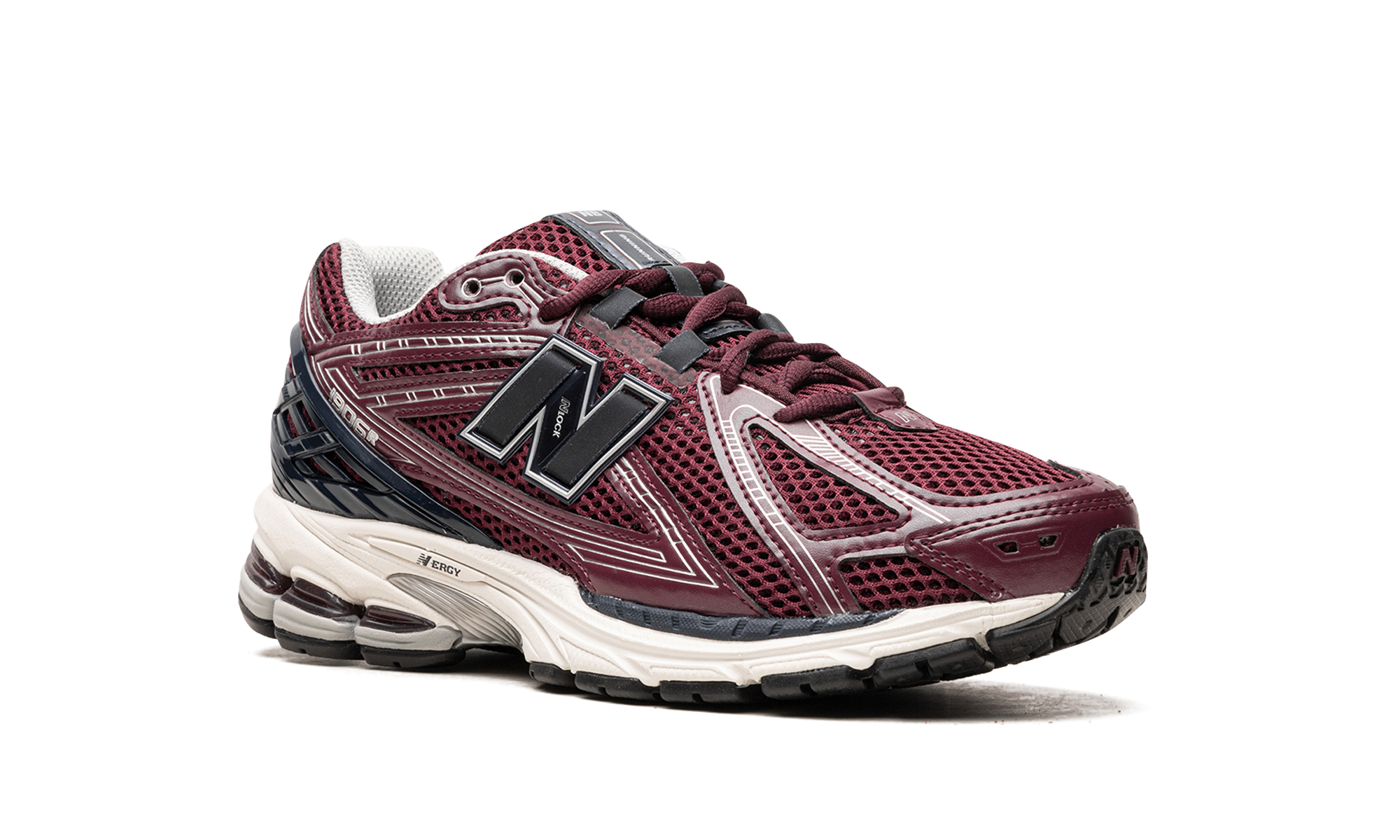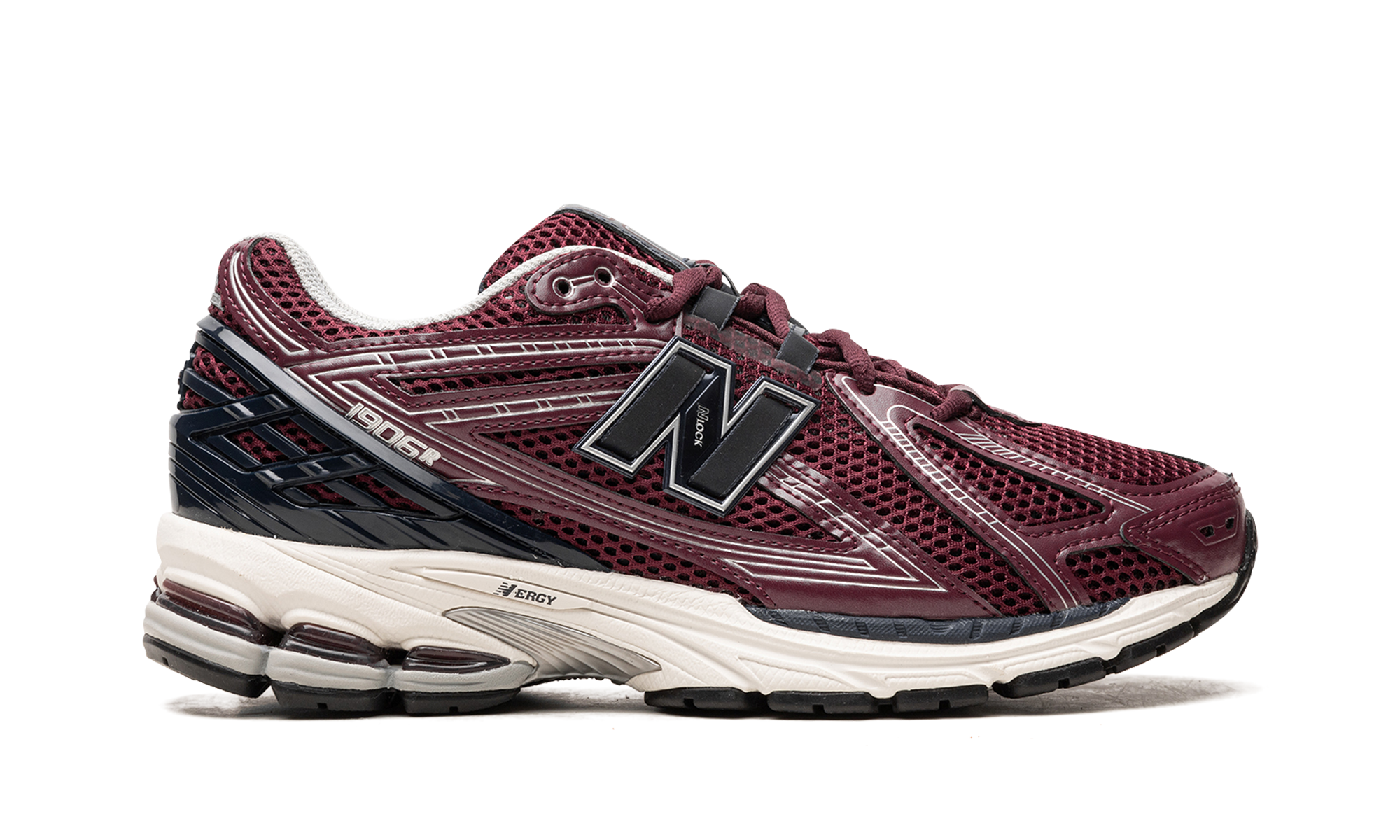 The New Balance 1906R "Bourgogne/Black" is a coloration lifestyle sports shoe with a unique look. The 1906R made its debut in 2010 before being part of the Y2K trend in sports shoes that began in 2022. The upper part has a construction in burgundy red open mesh with synthetic superpositionsons accented with white. A black “N” logo appears on the sides of the shoe. A black plastic talons counter ensures a support and locking adjustment. Under the feet, a cushioned midsole "N-ERGY" offers a constrong all day. Release date: March 18, 2023