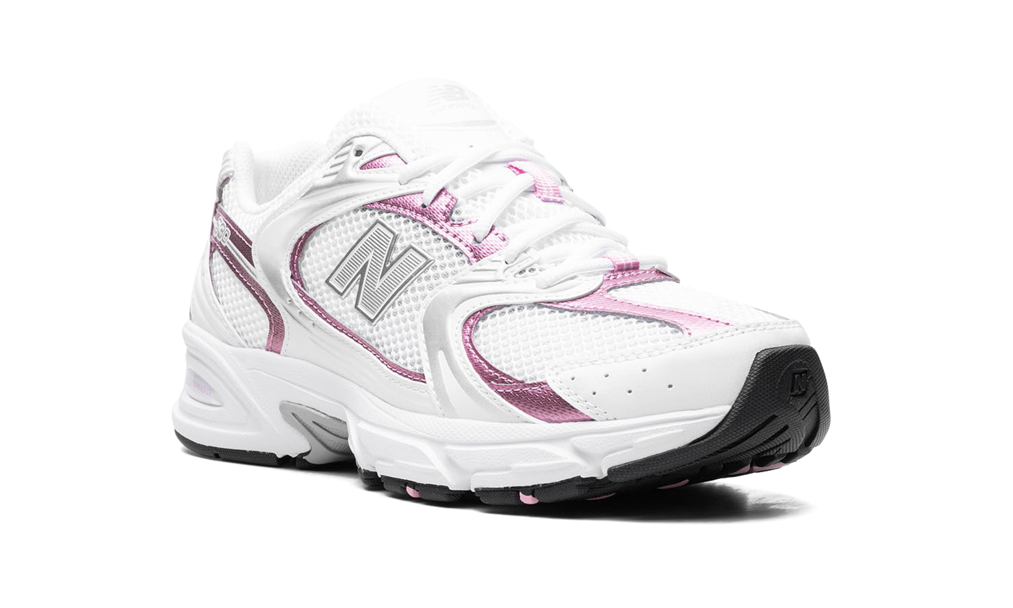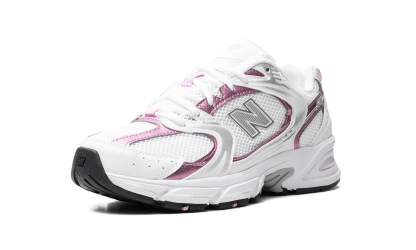 Discover the New Balance 530 "Pink Sugar", a retro running shoe with attractive pink accents. This shoe features a construction with white open mesh con trusted with superpositionsons in synthetic leather Pink Sugar in a metallic finishon, as well as superpositionsons in white and metallic silver. A "NB" logo appears on the tongue and a white foam midsole completes the look. Originally released in 1992, the 530 returns as an elegant lifestyle shoe.