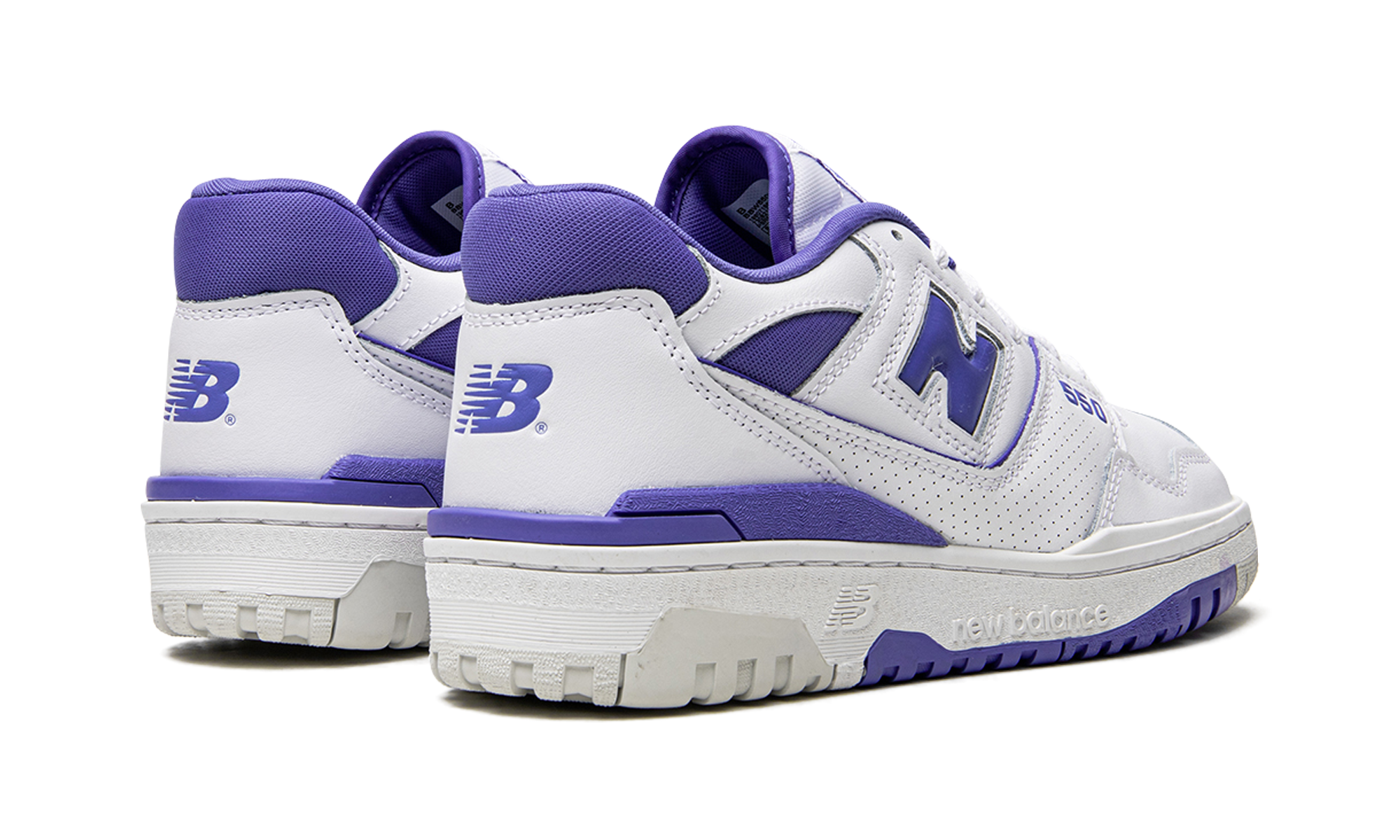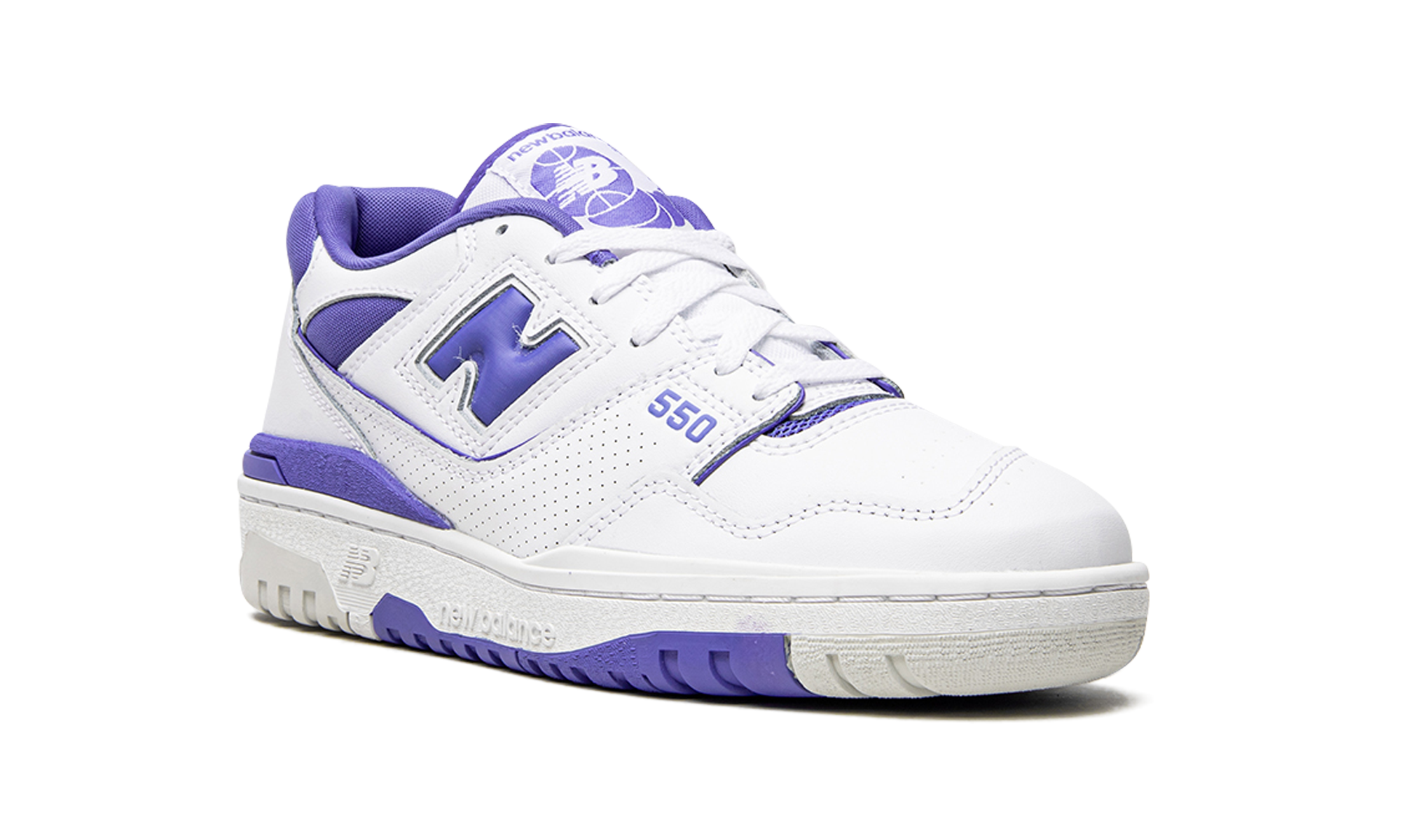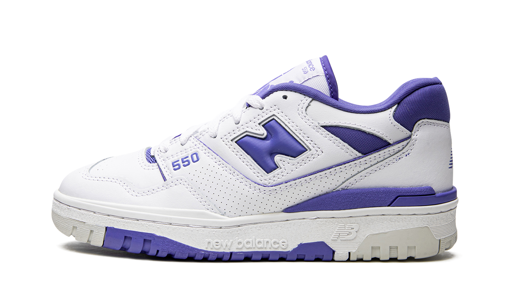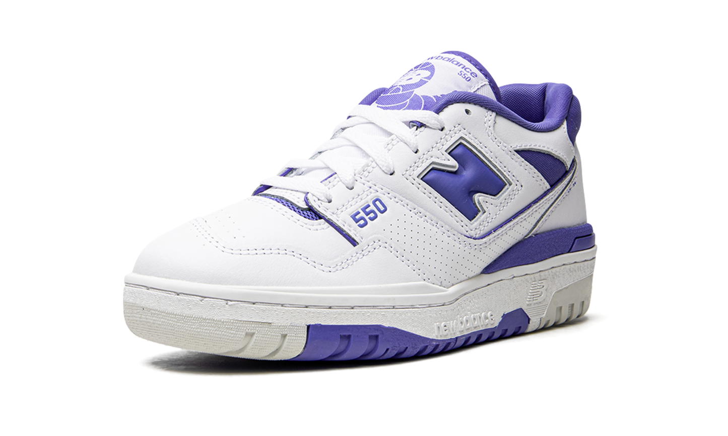 The New Balance 550 "Aura Purple" for women is the women's size of the vintage basketball shoe in a two-color, white and purple design. The upper part has a combination of smooth and dotted leather son on son toe, son talon and son center panel, respectively. An Aura Purple “N” logo appears on either side of the shoe and the purple “550” mark touches the forefoot. Additional details of the logo include the “NB” badge on the heelon and the “New Balance 550” mark on the tongue. A white rubber midsole and a grey and purple outsole complete the look.