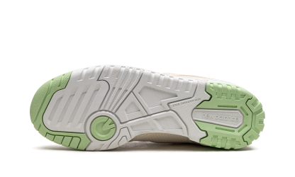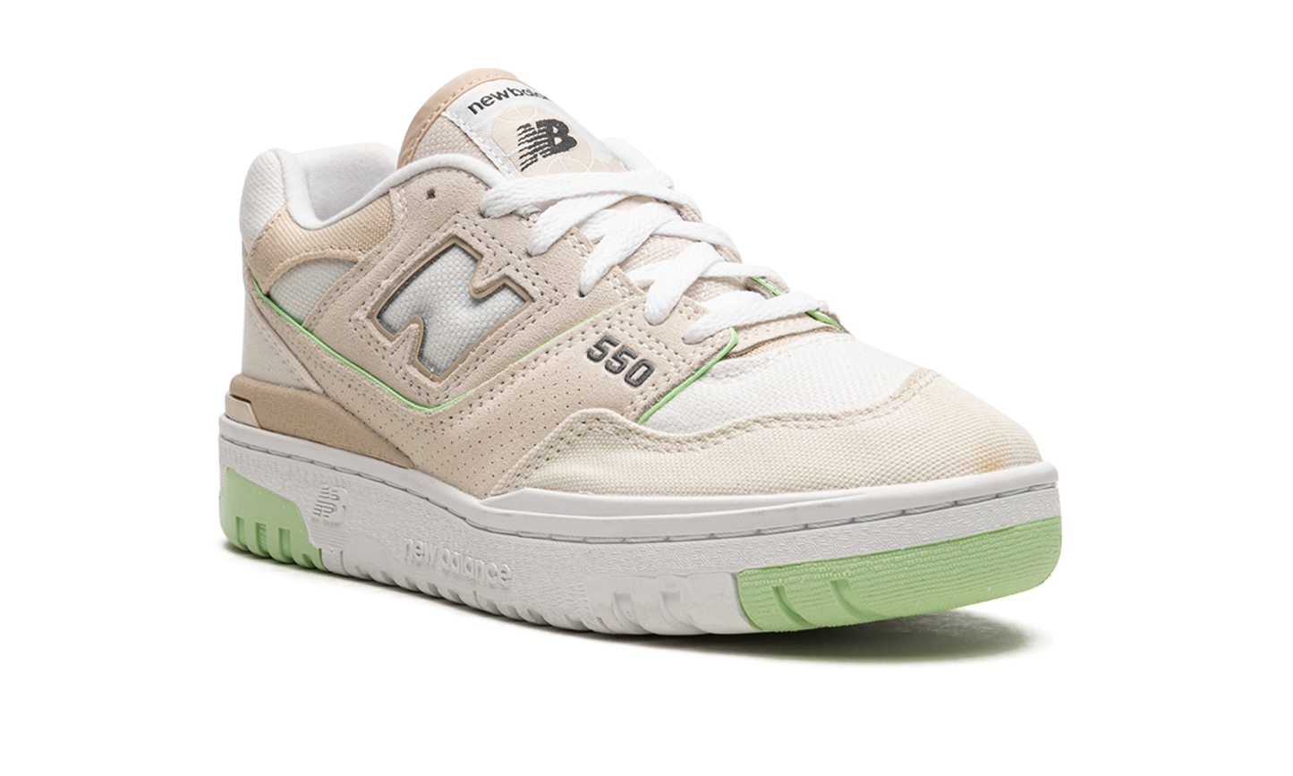 The New Balance 550 "Turtledove" for women is a coloration exclusive for women of the retro basketball shoe with a versatile appearance. The Turtledove 550 has a white mesh base with a on overlay of brown canvas toes and a on overlay of brown suede in the middle of the panel. A white “N” logo can be found on either side of the shoe. A grey “550” logo appears on the side of the forefoot and a “NB” detail is located on the tailon. A classic graphic "New Balance 550" appears on the tongue. A splash of color is provided by the piping at the green on the long of the superpositionon of the upper middle panel and on the rubber outsole.